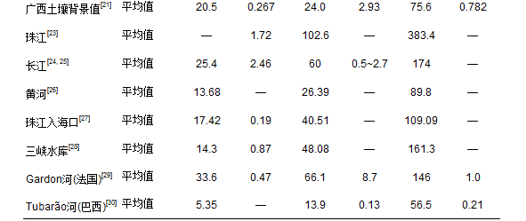 相比國(guó)內(nèi)其他河流, 龍江表層沉積物中Cd、Pb和Zn平均含量均要低于珠江平均值; 與長(zhǎng)江相比, As、Cd、Pb和Zn的平均含量相當(dāng), 但Sb含量要高出一個(gè)數(shù)量級(jí)以上; 與黃河相比, As、Pb和Zn平均含量均相對(duì)較高; 此外, As、Cd、Pb和Zn平均含量均高于珠江入海口和三峽水庫(kù).總體而言, 由于龍江受周邊重金屬高地質(zhì)背景和活躍的有色金屬礦業(yè)活動(dòng)直接或間接影響, 造成大量重金屬在龍江沉積物中富集.因此, 相對(duì)于長(zhǎng)江和黃河, 龍江重金屬含量相對(duì)偏高; 而與珠江相比, 由于珠江也受到更為強(qiáng)烈和多元的礦業(yè)等人為活動(dòng)的影響, 造成重金屬在珠江沉積物中富集程度比龍江更顯著.此外, 與世界其他河流相比, 龍江表層沉積物中As、Pb和Tl平均含量要低于受到金屬采礦活動(dòng)影響的法國(guó)Gardon河, 但Cd、Sb和Zn平均含量相對(duì)較高; 與長(zhǎng)期受煤礦開(kāi)采影響的巴西Tubarão河口相比, 龍江As、Pb、Sb、Zn和Tl的平均含量均較高.