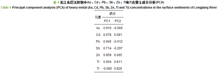 龍江表層沉積物中As、Cd、Pb、Sb、Zn、Tl和Ti等元素間Pearson相關(guān)性分析結(jié)果列于表 3中.結(jié)果顯示, As、Cd、Pb、Sb和Zn之間呈現(xiàn)顯著正相關(guān), 說(shuō)明它們之間具有同源性特征. Tl與其他重金屬之間均不存在顯著相關(guān)關(guān)系, 但與Ti之間呈顯著正相關(guān)關(guān)系, 表明Tl和Ti之間具有同源性.
