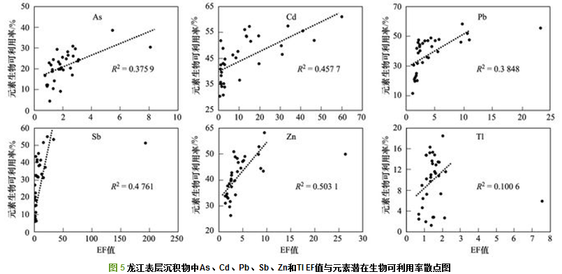 造成重金屬生物可利用態(tài)比例差異的原因主要包括元素本身的地球化學(xué)性質(zhì)、來(lái)源和沉積物理化性質(zhì)差異等. 圖 5為龍江表層沉積物中As、Cd、Pb、Sb、Zn和Tl的EF值與元素潛在生物可利用率間的散點(diǎn)圖.結(jié)果顯示, As、Cd、Pb、Sb和Zn的EF值與元素潛在生物可利用率間均呈顯著正相關(guān)關(guān)系.進(jìn)一步說(shuō)明龍江沉積物中As、Cd、Pb、Sb和Zn受人為活動(dòng)影響顯著; 與之相反, Tl的EF值與元素潛在生物可利用率間相關(guān)性不顯著, 表明Tl主要源于自然源的貢獻(xiàn).已有研究證實(shí)受到人為活動(dòng)影響的重金屬污染土壤或沉積物中, 重金屬生物可利用率更高. 圖 4中顯示重金屬高EF值點(diǎn)位主要分布在受人為活動(dòng)如有色金屬冶煉、城市污水排放、農(nóng)業(yè)活動(dòng)等影響強(qiáng)烈的區(qū)域, 而這些點(diǎn)位重金屬的生物可利用性比率也相對(duì)較高(圖 3).因此, 造成龍江表層沉積物中重金屬高生物有效性的主要原因很可能是受人為來(lái)源的影響顯著所致.