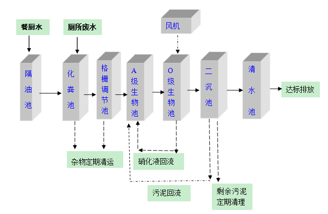 餐廚水經隔油池出去油污后和廁所廢水一樣進入化糞池,在化糞池中進行壓氧發酵,使污水中的大分子有機物含量減少,為后續處理降低壓力;然后流入經格柵攔截去除水中廢渣、紙屑、纖維等固體懸浮物,進入調節池,在調節池內均質、均量后經泵提升至A級生物池,在A級生物池段異養菌將污水中可溶性有機物水解為有機酸,使大分子有機物分解為小分子有機物,不溶性的有機物轉化成可溶性有機物,將蛋白質、脂肪等污染物進行氨化。在O級生物池段存在好氧微生物及消化菌,其中好氧微生物將有機物分解成CO2和H2O;在充足供氧條件下,硝化菌的硝化作用將NH3-N氧化為NO3-,通過回流控制返回至A級生物池,在缺氧條件下,異氧菌的反硝化作用將NO3-還原為分子態氮,接觸氧化池出水自流進入沉淀池進行沉淀,沉淀池上清液出水進入清水池短暫停留,出水達標排放。