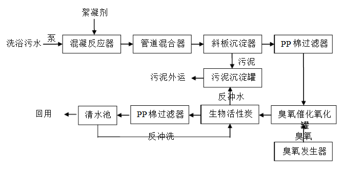 溫泉洗浴廢水經提升泵進入混凝反應器,同時經計量泵注入絮凝劑,在混凝反應器內對廢水進行混凝處理,之后經管道混合器進一步混凝、反應,然后進入斜板沉淀器進行泥水分離。上清液進入后續處理單元,污泥進入污泥沉淀罐。斜板沉淀器出水經PP棉過濾器過濾凈化,然后經臭氧催化氧化、生物活性炭過濾、PP棉過濾器過濾進入清水池,清水池出水排放或經反滲透處理后回用。