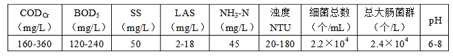 洗浴廢水的濁度很高,但色度不高,嗅味為強烈的洗浴用品的芳香味道,具有一定的COD、BOD和懸浮物,不會引起鐵、錳、砷、鉻、鎘、鉛、汞等重金屬物質超標。但洗滌劑和氨氮含量高于一般的生活廢水,受污染嚴重的水質參數主要由:洗滌劑、濁度、COD、BOD、細菌總數和大腸菌群等。
