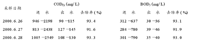 廢水處理設施于 2 0 0 0年 5月完工投入試運行 ,生化處理的菌種來自于城市污水處理廠未經厭氧消化的脫水污泥 ,經過 2個月的工程調試進入穩定運行狀態 ,于 2 0 0 0年6月底通過莆田市環境監測站的竣工驗收監測 ,運行結果見下圖。