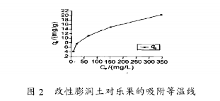2 .2改性膨潤土對樂果的吸附性能,在相同條件下,分別試驗原鈉基膨潤土、酸化改性膨潤土、酸化和煅燒改性膨潤土對樂果的吸附能力。結果表明:酸化和經(jīng)30 0℃煅燒2h后的改性膨潤土對樂果的吸附能力顯著提高,吸附容量達2 0mg/ g ;當其用量為1 7g/L(90目)、吸附時間為2h時,對樂果的去除率為85 %。在2 0℃時它的吸附等溫線,見圖2。