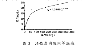 圖3中,Ce為吸附平衡時的樂果濃度;qe為吸附平衡時的吸附容量。對圖3擬合得方程:qe =1 34Ce0 .54 ,吸附等溫線符合Frendlish方程,且1 /n接近0 5 ,表明活性炭對樂果的吸附較易進行。