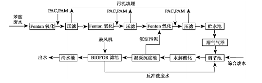 根據(jù)生產(chǎn)廢水高COD、高色度、高鹽分以及水量小的水質(zhì)特點(diǎn),將生產(chǎn)廢水單獨(dú)Fenton氧化預(yù)處理后通過氣浮除去廢水中的油相,與生活污水混合進(jìn)入生化處理。