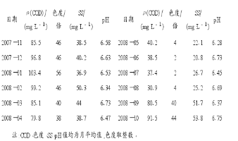 2008年4—8月出水水質(zhì)明顯好于其他月份,這是因?yàn)槊磕?—8月為公司停業(yè)檢修期,生化工段僅處理廠區(qū)生活污水;2008年1月出水COD和色度均劣于GB8978-1996中的一級(jí)標(biāo)準(zhǔn),這是由于2008年1月我國南方發(fā)生嚴(yán)重冰凍災(zāi)害,近10 d時(shí)間水解酸化池和BIOFOR內(nèi)的水溫為5~8℃,生化反應(yīng)受到嚴(yán)重抑制,導(dǎo)致出水水質(zhì)超標(biāo),公司對(duì)出水用活性炭吸附處理后達(dá)標(biāo)排放。