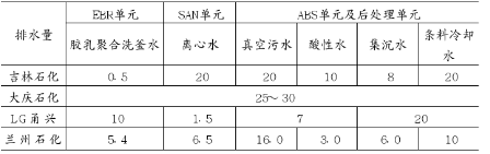 我國(guó)先后從美國(guó)、日本、韓國(guó)引進(jìn)ABS生產(chǎn)技術(shù),到2000年我國(guó)ABS樹脂的生產(chǎn)能力已達(dá)42×104t/a左右。其中生產(chǎn)裝置生產(chǎn)能力超過2×104t/a的共有7家,分別是蘭州石化公司、吉林石化公司、大慶石化公司、LG甬興、高橋石化、盤錦石化等。典型企業(yè)廢水排放情況見下圖。
