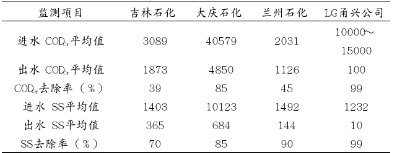 目前各生產(chǎn)企業(yè)并未對(duì)不同廢水分質(zhì)處理而是混合后集中處理,除LG甬興公司為三級(jí)處理外,其余企業(yè)多只設(shè)一級(jí)絮凝氣浮處理,處理后的污水再進(jìn)入污水廠處理,2000年上述四家企業(yè)正常工況ABS廢水處理情況見下圖。