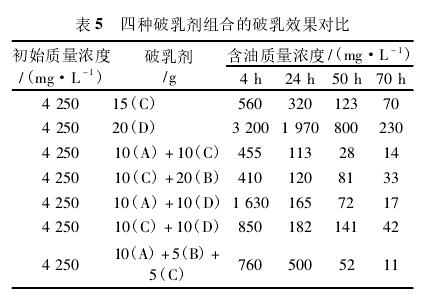 根據艦船乳化油污水的特性,選取最高乳化程度即乳化油質量濃度4000mg/L的油污水進行破乳試驗,在其中加入不同的破乳劑或破乳劑的組合,檢測其清液的含油量,考察其隨時間變化的破乳效果。同時,從化學破乳劑的應用角度要求既環保安全,不要造成二次污染,因此選取常見的破乳劑A、B、C及D作為本次試驗的破乳劑,采取不同破乳劑、相同投加濃度的破乳效果比較,同一破乳劑不同投加濃度破乳效果比較,以及不同破乳劑組合破乳效果比較的測試。