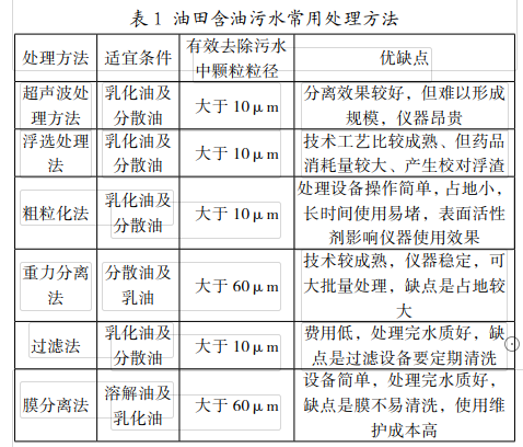 此外,污水中還會含有大量的化學劑物質。正由于油田污水的組成成分十分復雜,因而在對其進行回注時一定要對其進行相應的處理,不然的話,污水當中的各種雜質很有可能會因為和注水層的不配伍反應,進而產生各種沉淀物質,導致堵塞裂縫與地層縫隙的現象,進一步的,也會造成注水層的滲透效果不佳,使得注水的效率降低,也會使注水井的使用壽命大大縮短,造成的資源的浪費現象。所以,在進行回注操作之前,一定要對產生的污水進行一定的處理。就目前而言,比較長用的油田含油污水處理方法和這些方法所使用的條件如下表所示。