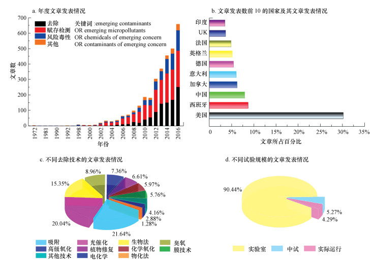 自20世紀末開始, 科研人員對ECs去除技術的關注度逐步提高, 相關領域的文章發(fā)表數(shù)逐年增加.在關心ECs的濃度檢測、環(huán)境賦存、毒性風險的同時, 學者們也開始關注ECs的有效去除技術(圖 1a).在各個國家中, 我國的相關研究起步較晚, 但后來居上, 發(fā)表的相關文章數(shù)量約占總數(shù)的6%左右, 僅次于美國和西班牙(圖 1b).目前, 已有多種針對ECs的去除技術的報道, 如生物法、吸附法、化學氧化法、膜技術及高級氧化法等等(圖 1c).據(jù)不完全統(tǒng)計, 吸附法、光催化氧化法、生物法及臭氧氧化法是目前研究最多的4種去除技術, 約占全部去除技術相關研究的66%.不同的去除技術存在各自的優(yōu)點和不足, 如生物法較易實現(xiàn)大規(guī)模應用, 但其去除效率低且不穩(wěn)定;臭氧氧化法、膜技術能實現(xiàn)較高的去除率, 但存在運行費用高、能耗高等問題等等.從中識別出去除效率高、經濟成本低的實用型去除技術對現(xiàn)有城市污水處理廠的升級改造及ECs的去除具有現(xiàn)實意義。