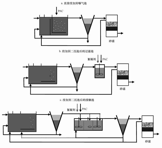 活性炭是廢水處理中最常用的吸附劑, 被用來去除各種有機污染物和有機碳.活性炭吸附通常采用的形式是投加粉末活性炭(PAC)或者顆粒活性炭(GAC)填料床過濾器.目前, PAC吸附是瑞士、德國等國家進行實際污水廠升級改造時使用最廣泛的技術, 僅德國已經有11個已經完成升級改造的污水處理廠采用PAC吸附技術.PAC的使用方式主要是直接投加在曝氣池或者二沉池后新增的絮凝池中, 需要后續(xù)的分離步驟, 但與GAC相比, 成本較低, 接觸時間較短.圖 2給出了最常見的3種PAC投加方式(Boehler et al., 2012), 即直接投加到曝氣池(圖 2a), 投加到二沉池之后的過濾池(圖 2b)和與絮凝劑一起投加到二沉池之后的接觸池(圖 2c).這3種投加方式均可實現(xiàn)對ECs的穩(wěn)定去除.圖 2a工藝最簡單, 投資費用最低, 后續(xù)濾池的設置可以保證出水水質, 降低PAC流失, 但這種工藝的PAC投加量最高;圖 2b和圖 2c工藝可以有效節(jié)省30%~50%的PAC投加量, 但流程相對復雜, 整體造價較高.GAC過濾器一般置于常規(guī)污水處理廠工藝中的二沉池之后, 既可吸附又可過濾, 它可以連續(xù)運行, 無需后續(xù)的分離步驟.