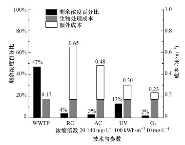 PAC吸附、臭氧氧化和NF/RO工藝都能實現(xiàn)對ECs的有效去除, 對比不同國家所用技術的去除效果和經濟成本十分困難, 因為每個處理工藝的規(guī)模、水質、目標污染物、操作條件等都不相同.圖 3給出了不同的ECs去除技術間的效果和成本的粗略對比, 該報告來自于斯德哥爾摩水務公司的一個持續(xù)四年的研究項目"藥品-檢出與水環(huán)境影響、預防措施和可行處理技術"(Wahlberg et al., 2010).從圖 3可以看出, 最經濟有效的去除技術是臭氧氧化和AC吸附, 采用臭氧氧化的額外成本僅提高了0.06·m-3, 總成本提高了35%, 采用臭氧氧化的總成本僅是采用AC吸附總成本的50%左右.然而瑞士采用PAC和臭氧氧化技術的大規(guī)模污水處理廠的實踐表明, 這兩種技術均可以對大部分ECs達到80%以上的去除率, 且兩種技術的成本幾乎持平, 對于小規(guī)模污水處理廠, 升級改造后的總成本將提高20%~50%, 而對于大規(guī)模污水處理廠, 總成本僅提高10%~20%。