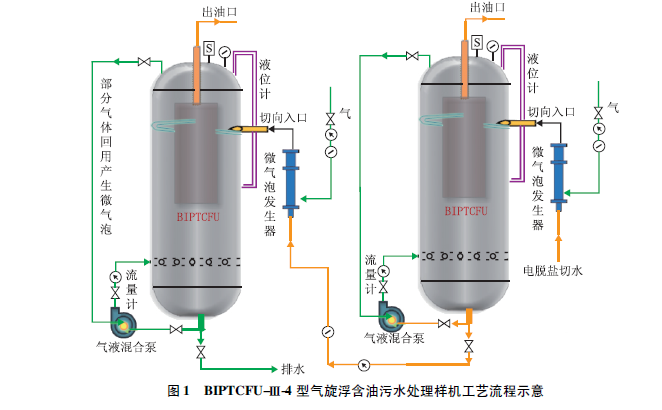 1.2工藝流程與工作原理北京石油化工學院多相流高效分離技術與設備研究所自2005年以來在國內率先關注并著手自主研究氣旋浮含油污水復合處理技術,在推出BIPTCFU-Ⅰ型、BIPTCFU-Ⅱ型可視化樣機的基礎上,自主研發的BIPTCFU-Ⅲ-4型氣旋浮含油污水處理樣機在中國石化中原油田、中國海油秦皇島(QHD)32-6油田和流花(LH)11-1油田等地成功進行了現場試驗,且在水力停留時間、除油率等性能指標方面位居國內前列。圖1為BIPTCFU-Ⅲ-4型氣旋浮含油污水處理樣機的工藝流程示意。樣機主要包括微氣泡發生器、氣液混合泵、氣旋浮罐等;采用撬裝模塊化設計,總體上采用兩級CFU串聯且各級可相對獨立運行。核心設備氣旋浮罐主要由立式壓力容器罐體、內部穩流筒、污水切向入口、頂部排氣口、頂部排油口、底部排水口等組成,有效容積為0.17m3,內徑為Ф400mm,高度為1675mm。樣機的設計處理量為4m3h,設計水力停留時間為2.5min,旋流強度為35g,設計處理量下的表面水力負荷率為32.65m3(m2·h)。