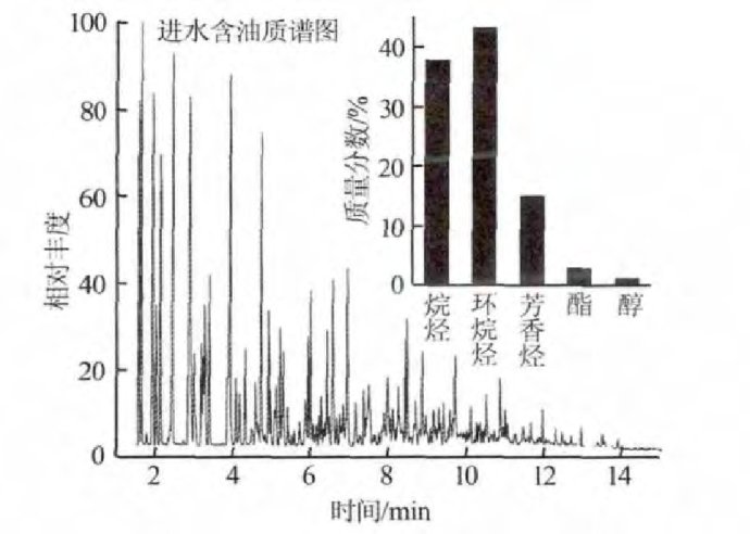 某石化公司通過對其電脫鹽污水性質的分析,發現其含有大量的乳化油和微小固體顆粒。由于微小油珠易被表面活性劑和疏水固體顆粒所包圍形成穩定狀態懸浮于水中,因此這種狀態的油很難用重力分離法從污水中分離出來,這造成了其原有隔油池分離效率很低。中試進水直接從隔油池至調節罐之間的管道上接管分出,所含油類成分分析見圖1。