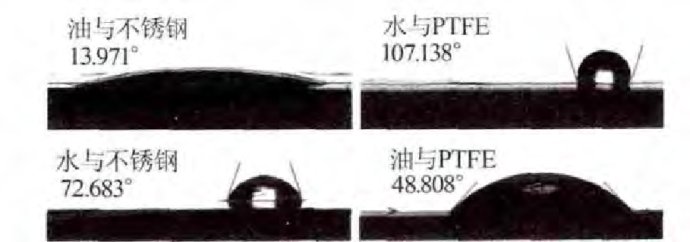 粗粒化聚結模塊:該模塊類似于波紋板聚結填料,油水在上下錯流流動過程中,細小油滴可以迅速富集到粗粒化模塊的親油性表面形成油膜,水中夾帶的小油滴可以迅速與油膜結合,脫離后形成大油滴,實現了分散態向游離態油滴的轉化。聚結床層所用材料應是表面親油疏水的物質,油、固表面接觸角應小于70°為宜,接觸角越小,親油潤濕性能越好。圖2為部分試驗材料的潤濕性。本試驗設備該模塊采用不銹鋼材質。