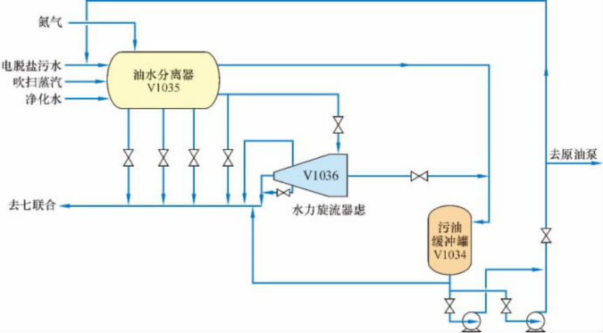 電脫鹽污水除油設施的工藝流程為:電脫鹽污水首先經過換熱,然后進入超聲波油水分離器(V1035)進行二級沉降分離,經過分離器二級分離沉降后的高濃度污油水經過撇油管排入撇油槽,再經過撇油槽排入污油水緩沖罐(V1034)。經過二級分離沉降后的低含油污水中油質量濃度如果低于200mg/L,則可以直接外排到下游裝置處理,反之則經過水力旋流器(V1036)進行污油水進一步分離,低污油水外排,高含油污水排入污油水緩沖罐。高含油污水在污油水緩沖罐內,通過污油水循環泵可以打回原油泵入口進行回煉,也可以打回分離器污油水入口進行循環處理直至污油水含油濃度合格。此外,污油水分離器通過氮氣系統進行惰性氣體保壓,保證水力旋流器平穩運行。此外,污油水分離器連接有蒸汽管線和凈化水管線,定期用蒸汽對波紋斜板進行吹洗,用凈化水對分離器底部淤泥沖洗,保證除油設施高效運行,除油設施工藝流程圖見圖3。