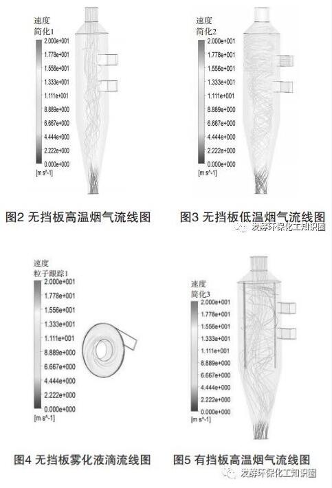 5)低溫煙氣從霧化噴嘴后分幾路沿切線方向進入蒸發器,為霧滴蒸發提供持續熱源,同時,由于切向進風煙氣沿筒壁速度快,使霧滴不碰壁,避免結垢。采用如此分級煙氣進入的設計,一方面,有利于霧滴在煙氣中均布;另一方面,可減少高溫煙氣的使用量,節約運行成本。