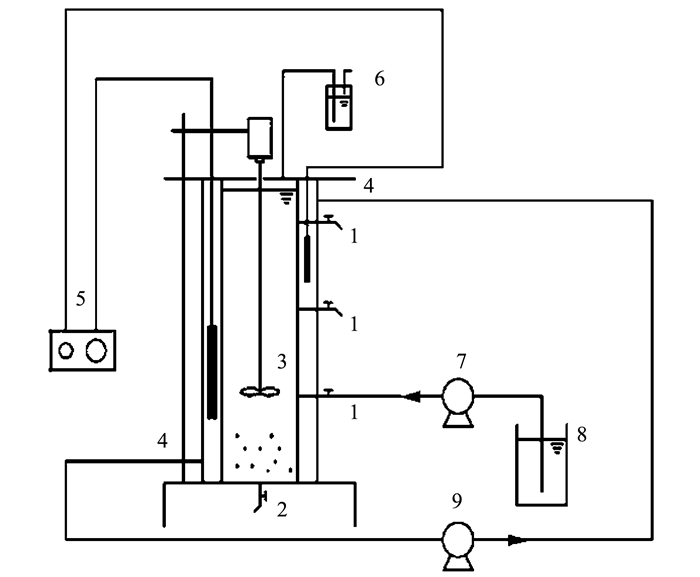 試驗采用ASBR厭氧氨氧化反應器, 其結構如圖 1所示.該反應器由有機玻璃制作而成, 有效體積7 L.人工配制的廢水從反應器下部的進水口由恒流泵進入反應器內, 內置電動攪拌器, 整個反應器表面用黑布包裹, 防止光線對厭氧氨氧化活性污泥造成負面影響, 反應器的外層有恒溫水浴, 溫度控制在(35±2)℃。