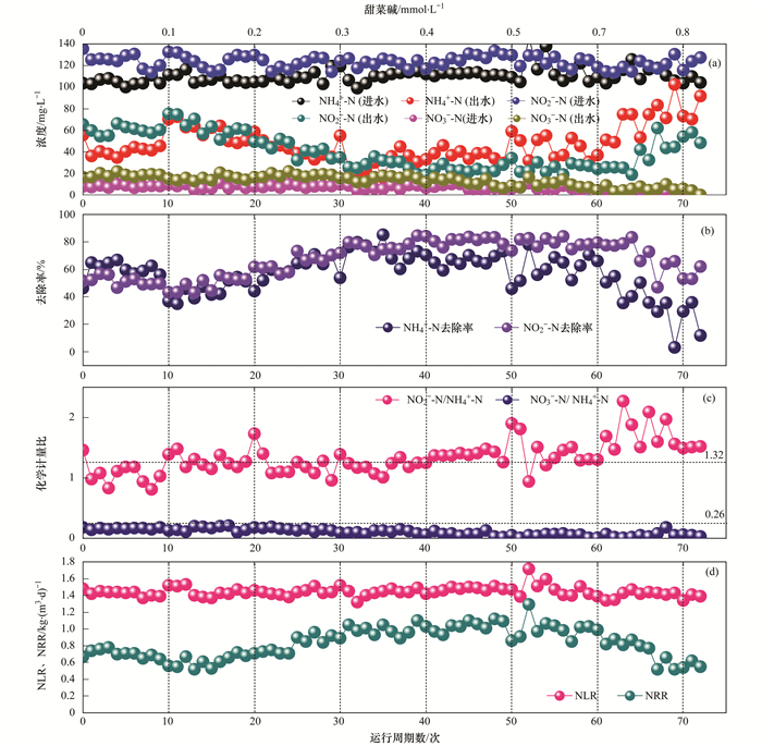 參考已有的研究成果, 且防止過量添加引起反應器內菌群結構尤其是反硝化細菌的崛起, 將甜菜堿添加初始量設定為0.1 mmol·L-1, 添加甜菜堿濃度分別為0、0.1、0.2、0.3、0.4、0.5、0.7 mmol·L-1.每個梯度試驗5 d, 甜菜堿過量會使系統中產生反硝化細菌, 進而對反應產生抑制, 因此在反應器產生抑制時應及時停止試驗, 從產生抑制的甜菜堿濃度開始再緩慢降低甜菜堿的濃度, 考察甜菜堿濃度的回落能否使厭氧氨氧化反應效能得到恢復。