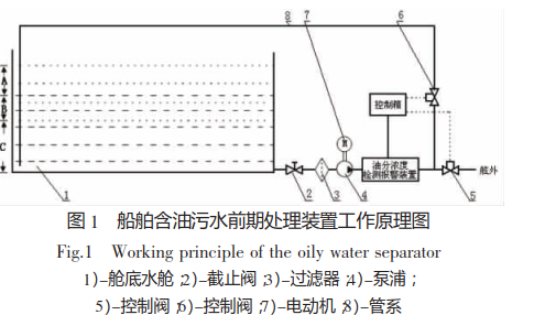 艙底水艙中的A為油層,B為油水混合層,C為水層。該裝置的工作原理為:打開截止閥2),合上電動機7)電源開關,泵浦4)開始工作,從艙底水艙1)中吸入 污水,泵浦4)排出的污水通入到油分濃度檢測報警裝置,該裝置中的傳感器感應艙底污水的含油量,含油量小于15mg/L時,控制箱使控制閥5)打開,控制閥6)關閉,控制閥5)打開時泵浦直接向舷外排出污水。當艙底污水含油量大于15mg/L時,控制箱使控制閥5)關閉,控制閥6)打開,此時泵浦排出的艙底污水經過控制閥6)重新返回到艙底水艙。該裝置將含油量小于15mg/L的污水直接排向舷外,因此可以大大減小進入油水分離器的含油污水總量,降低油水分離器的工作負荷,減輕船員油水分離方面的工作量,提高了船員油水分離工作的積極性,減小污染。