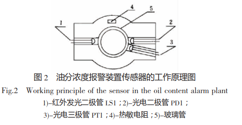 還船舶含油污水前期處理裝置使用了油分濃度檢測報警裝置,該報警裝置傳感器的工作原理如圖2所示,具體零部件的名稱及作用如下: