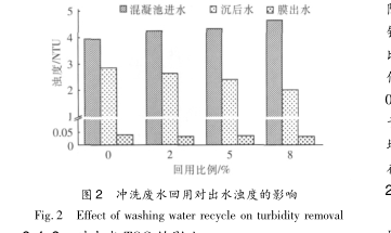 膜沖洗廢水回用對沉后水和膜出水濁度的影響如圖2所示。膜沖洗廢水回用對沉后水濁度的去除有明顯的強化作用,當不回用時,混凝沉淀對濁度的去除率較低,僅為27.84%;隨著回用比例的增加,沉后水濁度逐漸降低,當回用比例達到8%時,混凝沉淀對濁度的去除率可達56.75%。這主要是由于原水濁度較低,混凝過程缺乏絮凝核心,而反沖洗廢水中含有較多的微絮凝顆粒,可為水中的膠體物質提供絮凝核心,使微小的顆粒物質更易于形成較大的絮體,有利于顆粒物質的去除。膜沖洗廢水回用對膜出水濁度無明顯影響,膜出水濁度均在004NTU以下,這是由于超濾膜的物理截留作用,可以保證其對顆粒物及微生物的高效去除,避免了沖洗廢水回用而可能引起的微生物特別是“兩蟲”富集的風險。
