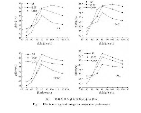 綜上所述,4種混凝劑的最優投加量均為80mg/L。對比4種混凝劑的混凝效果可以發現,Al13由于含有較高濃度的具有大量正電荷的Alb成分,在較低的投加量下即可獲得較好的混凝效果,以SS為例,Al13在70mg/L的投加量下去除率即達到70%以上,而其他3種混凝劑達到如此去除率時的投加量均達到80mg/L。對于其他2項指標均可以得到相似的結論,在最優混凝劑投加量下,使用Al13作混凝劑,在最優的條件下SS的去除率達到92.47%,色度去除率為88.49%,COD的去除率為80.47%。