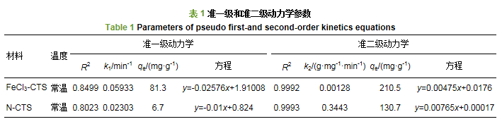 采用準一級和準二級動力學方程,描述亞甲基藍從廢水擴散到FeCl3-CTS的動力學過程(賈海紅等, 2011).準一級和準二級動力學方程如式(3)、(4)所示: