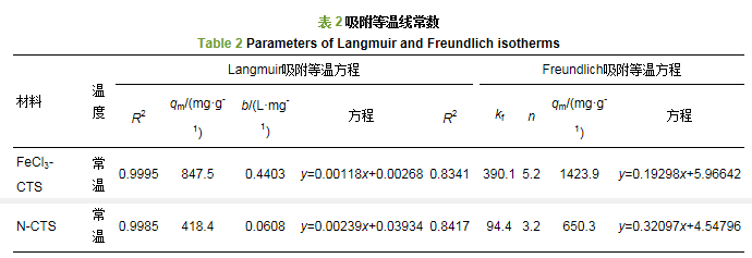 3) 吸附動力學和等溫線擬合結果表明,FeCl3-CTS處理亞甲基藍廢水的過程更符合準二級動力學和Langmuir描述的吸附過程.