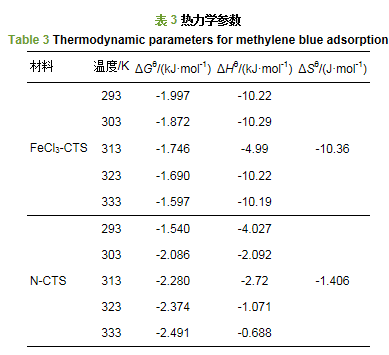 FeCl3-CTS和N-CTS吸附亞甲基藍過程的熱力學參數如表 3所示,表明吸附過程是熱力學自發過程(ΔGθ<0),吸附反應是放熱反應(ΔHθ<0),FeCl3-CTS和N-CTS吸附亞甲基藍的反應增加了固-液界面上物質無序程度(ΔSθ<0).