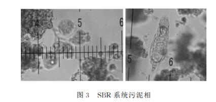 SBR池主要用于去除廢水中COD和酚類等,SBR池反應(yīng)周期為8h,含2個反應(yīng)池,排水比例約為25%。設(shè)計池容320m3,共2個池子,單池池容160m3,反應(yīng)器內(nèi)曝氣系統(tǒng)選用羅茨鼓風(fēng)機(jī)供氧。本試驗進(jìn)水為水解酸化池出水,接種鄰近福州市祥板污水處理廠好氧污泥10t,兩個池體分別接種5t,通過鏡檢發(fā)現(xiàn)該污泥生物相活性較好,菌膠團(tuán)結(jié)構(gòu)密實(shí)。在啟動初期,鏡檢發(fā)現(xiàn)SBR池內(nèi)活性污泥豆形蟲較多,但SV30值較低,污泥活性不高,隨著活性污泥逐步適應(yīng)煤氣洗冷廢水水質(zhì),SBR池生物相逐漸發(fā)生變化,開始出現(xiàn)鐘蟲和輪蟲等,SBR系統(tǒng)污泥相如圖3所示。