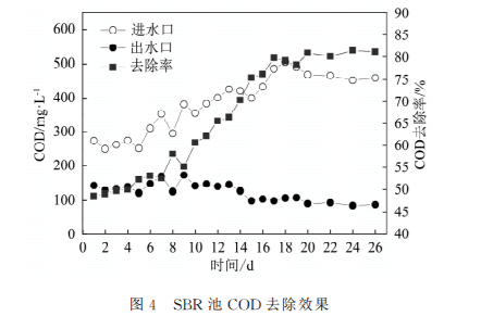 由圖3可以看出,啟動過程中由于SBR池中存在著較大的濃度遞度,且缺氧、好氧段交替變化,有效地抑制了絲狀茵的生長與繁殖,系統(tǒng)內(nèi)未出現(xiàn)污泥膨脹現(xiàn)象,極大地提高了系統(tǒng)穩(wěn)定性與抗沖擊負(fù)荷能力。此外,電-Fenton池因反應(yīng)需要而添加的電解質(zhì)NaCl也未對后續(xù)生化處理單元產(chǎn)生抑制影響。SBR池整個啟動過程較為順利,SBR池COD去除效果如圖4所示。具體聯(lián)系污水寶或參見http://www.bnynw.com更多相關(guān)技術(shù)文檔。