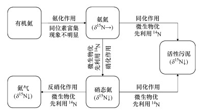 基于同位素分餾效應(yīng)(Banner et al., 1995),穩(wěn)定同位素檢測為水中氮素的遷移轉(zhuǎn)化過程(Hoefs et al., 1997)研究提供了技術(shù)方法.Handley和Raven(1992)在1992年,就將同位素分餾效應(yīng)用于解釋硝化反硝化過程中的物質(zhì)遷移轉(zhuǎn)化,Barford等(1999),Karen等(2003)和Lehmann(2004)也對此開展了進(jìn)一步研究,得出在硝化與反硝化過程中均存在著明顯的同位素分餾效應(yīng),使得液相中無機氮的氮同位素比值上升.隨著活性污泥同化作用的發(fā)生,其δ15N值隨液相無機氮δ15N值的升高而升高.所以,脫氮效果不佳,就意味著δ15N值下降.
