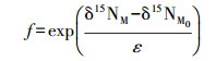 此時,水中剩余無機氮的占比就可以表示為固相中活性污泥的δ15NM0的函數(shù),其中,ε和δ15NM0為常數(shù);剩余無機氮占脫氮反應(yīng)發(fā)生前無機氮的比例f由[NH4-N+NOx-N]出水/[NH4-N+NOx-N]進(jìn)水定義.