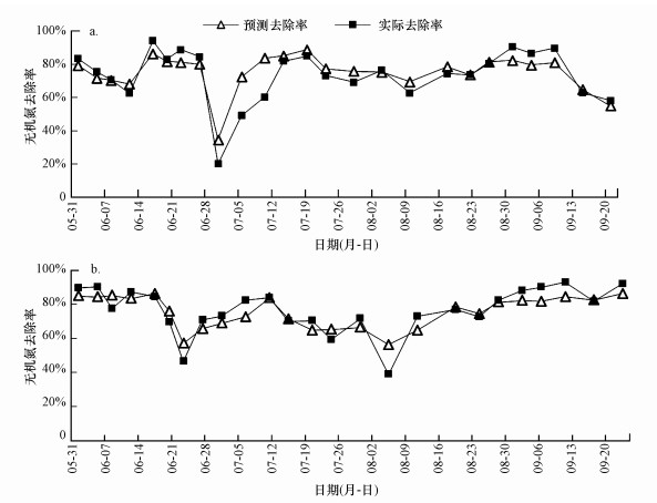 西安市第三、第四污水處理廠生物池進(jìn)出水水質(zhì)特性如表 1所示.將測得的二沉池進(jìn)水中活性污泥的δ15N、ε及δ15NM0帶入式(6)進(jìn)行無機氮去除效率的預(yù)測并與實際測得的無機氮去除率進(jìn)行相關(guān)性分析,結(jié)果如圖 4所示.其中,圖 4a為西安市第三污水處理廠的預(yù)測結(jié)果與實際值的對比(r=0.857,p<0.001),圖 4b為西安市的四污水處理廠的預(yù)測結(jié)果與實際值的對比(r=0.886,p<0.001).該結(jié)果表明,上文所得模型對具有不同水處理限制因素的污水處理廠均適用.