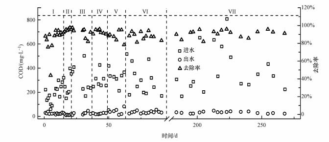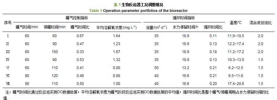 生物反應器間歇曝氣池通過PLC自動控制曝氣和停曝時間,實現間歇式曝氣.曝氣階段溶解氧濃度由溶氧儀(型號:WTW IQ SensorNet 2020 XT Controller)控制.當曝氣后溶解氧的濃度達到設定上限值(如2.5 mg·L-1)時,曝氣風機自動停止曝氣,此時混合裝置自動開啟,生物反應器中生物消耗溶氧.當溶解氧濃度下降到設定下限值(如0.5 mg·L-1)時,曝氣風機自動開啟,進行鼓風曝氣.本研究中通過調節曝氣時間比、混合液回流比、HRT等組合工況條件,考察了該生物反應器去除COD、氮、磷效果.每個工況維持至少15 d,其中,工況Ⅵ維持30 d以上,工況Ⅶ維持3個月.工況條件如表 1所示.