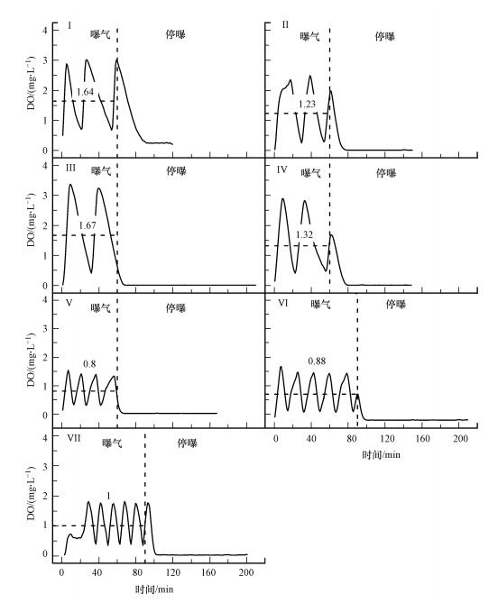 生物反應器間歇曝氣池中溶解氧在一個間歇曝氣周期隨時間變化情況如圖 2所示.曝氣階段,池中平均溶解氧濃度由圖中水平虛線標示.以工況Ⅰ為例,曝氣開始時,池中溶解氧濃度上升,當達到曝氣上限2.5 mg·L-1時,曝氣泵停止工作;當溶解氧達到設定下限0.5 mg·L-1時,曝氣泵自動開啟.如此循環往復,直到曝氣周期停止,池中平均溶解氧濃度為1.64 mg·L-1.當曝氣階段結束,進入停曝混合階段,溶解氧需要被消耗10~20 min才能進入缺氧階段.傳統活性污泥法要求曝氣池溶解氧濃度不小2.0 mg·L-1,以保證硝化反應的完全.研究表明,降低反應器溶解氧濃度,可以減小曝氣能耗,如將曝氣溶解氧濃度控制在0.5 mg·L-1,據估計將節約10%的運行能耗(Liu et al., 2013).同時低溶解氧濃度可以促使反應器中菌群變化,促進同步硝化反硝化的進行,提升TN去除率(呂錫武等,2001;吳昌永等,2012;Liu et al., 2013).