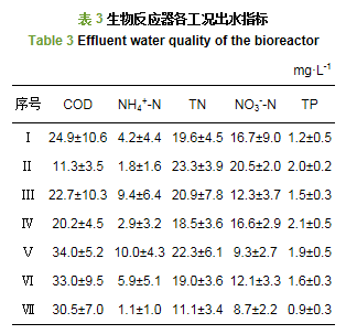 生物反應器對COD的去除效果見圖 4,各工況的出水COD見表 3.可以看出,進水COD波動較大,但生物反應器對COD的去除率在運行期間穩定達到90%以上.生物反應器中可以維持很高的污泥濃度,保證其面對水質波動變化時具有較好的適應能力.調整工況后對COD的去除效果影響不大,可能是因為異養菌對溶解氧的親和力強于自養菌,因此,在溶解氧較低的狀態下,異養菌將會率先利用氧氣進行代謝活動,可以較好地代謝水中的COD(殷峻等,2013).