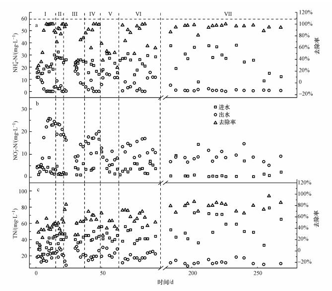 生物反應器在運行期間未從反應區主動進行排泥,系統內的MLSS是常規活性污泥污水廠的4倍,可以穩定達到10000 mg·L-1以上(圖 3).污泥經過截留池的沉降,通過污泥回流裝置回到曝氣池,因此,較重的污泥經過自動重力遴選保留在生物反應器中.終沉池只對出水進行澄清,產生的污泥量很少,可以通過排泥裝置排出.MLSS在接種后開始迅速上升,20 d左右達到10000 mg·L-1左右.工況Ⅲ由于設備重新移動,使得污泥量減少,但之后很快重新達到穩定狀態.污泥體積指數逐漸上升并穩定在80~100 mL·g-1,顯示出良好的污泥沉降性能.在工況Ⅴ和Ⅵ,生物反應器中平均水溫降至10 ℃以下,沒有出現污泥膨脹現象,這與前期研究的結果一致(Liu et al., 2017).工況Ⅶ進入春、夏季,溫度回升,MLSS達到12000 mg·L-1以上,并隨著污泥量的增多,其污泥體積指數略有下降.