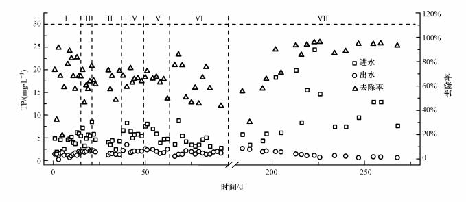 3) 通過間歇曝氣,生物反應器可達到良好的除磷效率.穩定運行后,TP去除率可以達到80%以上.