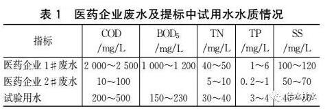 取水方案為采用罐車按3車次/d,每車次7m3的水量將醫藥企業1#廢水運送至中試基地內調蓄池;采用管道導入按80~90m3/d將醫藥企業2#廢水泵送至中試基地內調節池,按企業1#廢水0.4m3/h和企業2#廢水3.8m3/h混合成試驗用水,具體水質情況見表1。