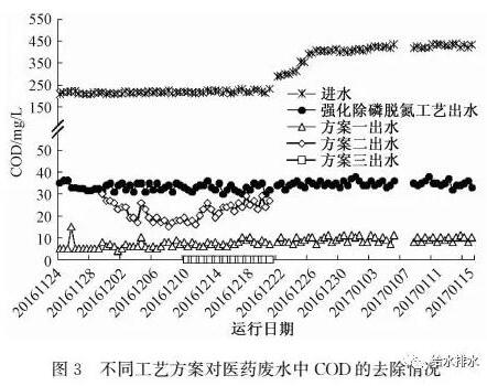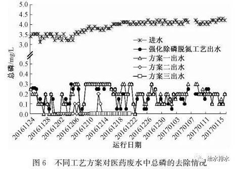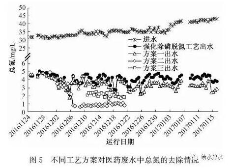 由圖4可以看出,由于醫藥廢水混合后中氮的濃度較低,在運行期間會投加10~15mg/L的氯化銨來調整進水NH3-N濃度并控制在30~40mg/L。系統運行穩定后,平均出水NH3-N低于0.1mg/L,對于NH3-N的平均去除率已達到99%以上。由于強化除磷脫氮工藝具有較優的硝化效果,NH3-N主要在前端的生物處理單元去除,出水NH3-N濃度較低在0~0.8mg/L,方案一~方案三出水NH3-N濃度均低于0.1mg/L。出水滿足IV類水標準限值要求(NH3-N≤1.5mg/L)。