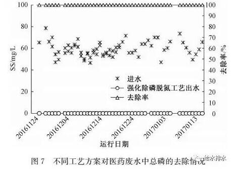由圖7可以看出,在整個調試及穩定運行階段,強化除磷脫氮工藝進水SS濃度為42.1~82.3mg/L,由于強化除磷脫氮工藝出水經二沉池沉淀后出水效果穩定較優,出水SS均在檢測限外。
