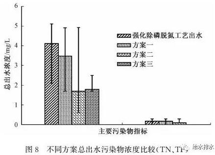 通過上述3組深度處理方案對強化除磷脫氮工藝出水污染物的去除效果研究,下面將各污染指標的處理情況進行對比分析,圖8和圖9為不同方案總出水污染物濃度比較。