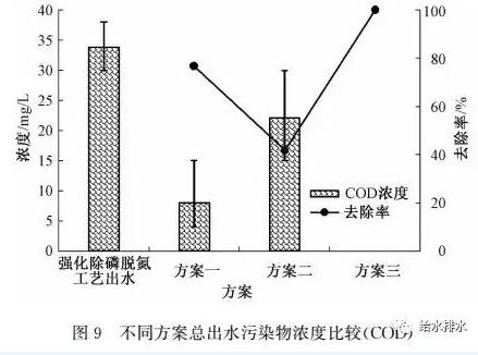 綜上所述,方案三雖然對各污染指標均具有最優的處理效果,但因其投資成本和運行費用較高,不適宜大規模水量處理使用。方案一作為強化除磷脫氮工藝的后接深度處理單元,主要針對二級出水中的有機物進行了強化去除,使得最終出水中各污染物指標均可穩定到達地表水IV類標準限值要求。