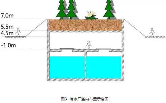 泰和污水處理廠一體化箱體的豎向布置標高綜合考慮工程投資、工程安全、進出水水力銜接、環境協調和綠化景觀等方面的需求。污水廠周邊市政道路的設計地面標高約4.50m,一體化箱體的豎向布置采用箱體頂標高高于周邊道路1m的方案(箱體內操作層標高-1.00m;箱體頂板標高5.50m),箱體分兩層,地下二層為水處理層,主要為鋼筋混凝土水池結構;地下一層為操作層,主要為框架結構,箱體頂部覆土厚度1.5m實施綠化。污水廠的這個高程布置方案在滿足綠化景觀建設要求的前提下,通過適當抬升豎向布置高程,既節省了工程造價,也一定程度提升了工程實施及運行的安全性。污水廠整體豎向布置如圖3所示。