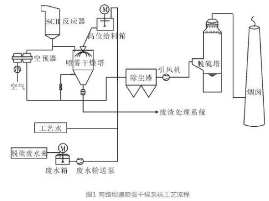 該工藝原理是從脫硝系統(tǒng)出口引出熱煙氣,經(jīng)旁路煙道送至噴霧干燥塔;脫硫廢水經(jīng)管路進(jìn)入干燥塔,經(jīng)過高速旋轉(zhuǎn)的霧化器霧化為細(xì)小液滴群后與煙氣進(jìn)行充分的熱交換,利用煙氣余熱瞬間干燥脫硫廢水,蒸發(fā)產(chǎn)生的大部分固體物質(zhì)從噴霧干燥塔底部的排放口排出;經(jīng)噴霧干燥塔干燥后的尾氣返回電除塵器進(jìn)口。該工藝流程如圖1所示。