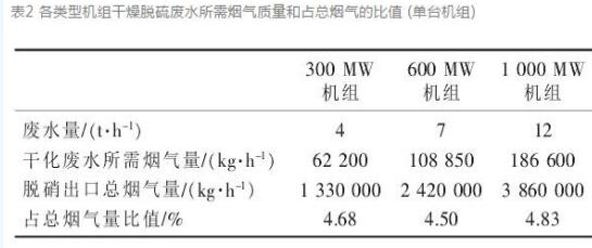 脫硝出口煙氣約為350℃,干燥廢水后降至約125℃,煙氣焓降約200kJ/kg,經(jīng)計(jì)算,干燥1t廢水所需煙氣量約為15550kg,采用此工藝的各類型機(jī)組干燥脫硫廢水所需煙氣質(zhì)量和占總煙氣的比值見表2(單臺機(jī)組)。